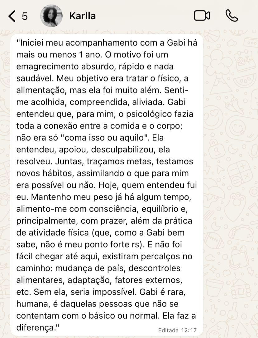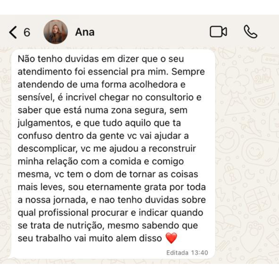 Nunca esqueço de uma paciente que chegou até mim exausta, dizendo: "Eu não sei mais o que fazer, parece que a comida manda em mim." E eu entendi bem aquela dor, porque também já acreditei que a única saída era começar mais uma dieta. Mas foi mergulhando na nutrição comportamental e ouvindo centenas de mulheres que percebi uma verdade simples e transformadora: Ninguém nasceu em guerra com a comida, essa luta foi criada pelas dietas, e pode ser desconstruída.