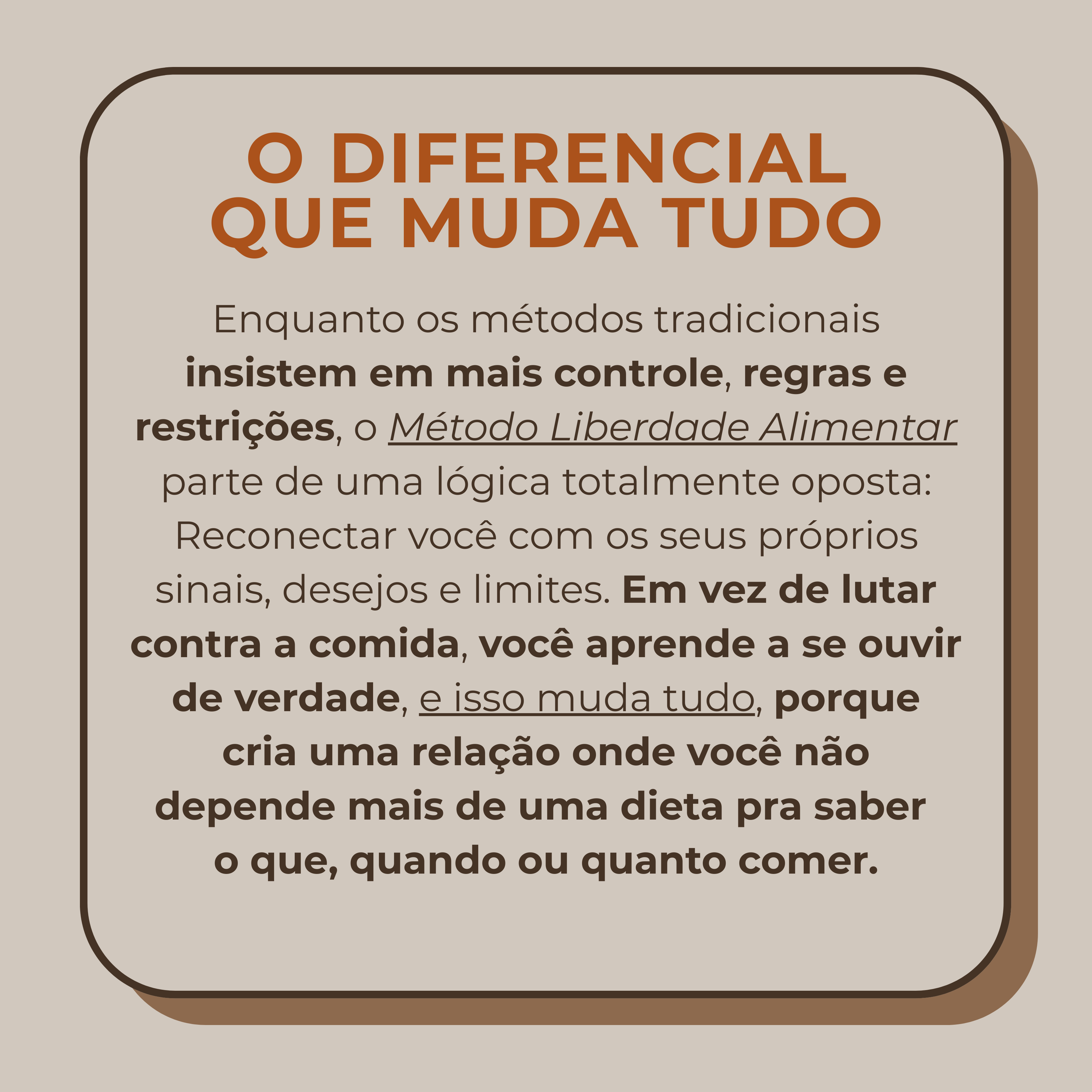 Enquanto os métodos tradicionais insistem em mais controle, regras e restrições, o Método Liberdade Alimentar parte de uma lógica totalmente oposta: Reconectar você com os seus próprios sinais, desejos e limites. Em vez de lutar contra a comida, você aprende a se ouvir de verdade, e isso muda tudo, porque cria uma relação onde você não depende mais de uma dieta pra saber o que, quando ou quanto comer.