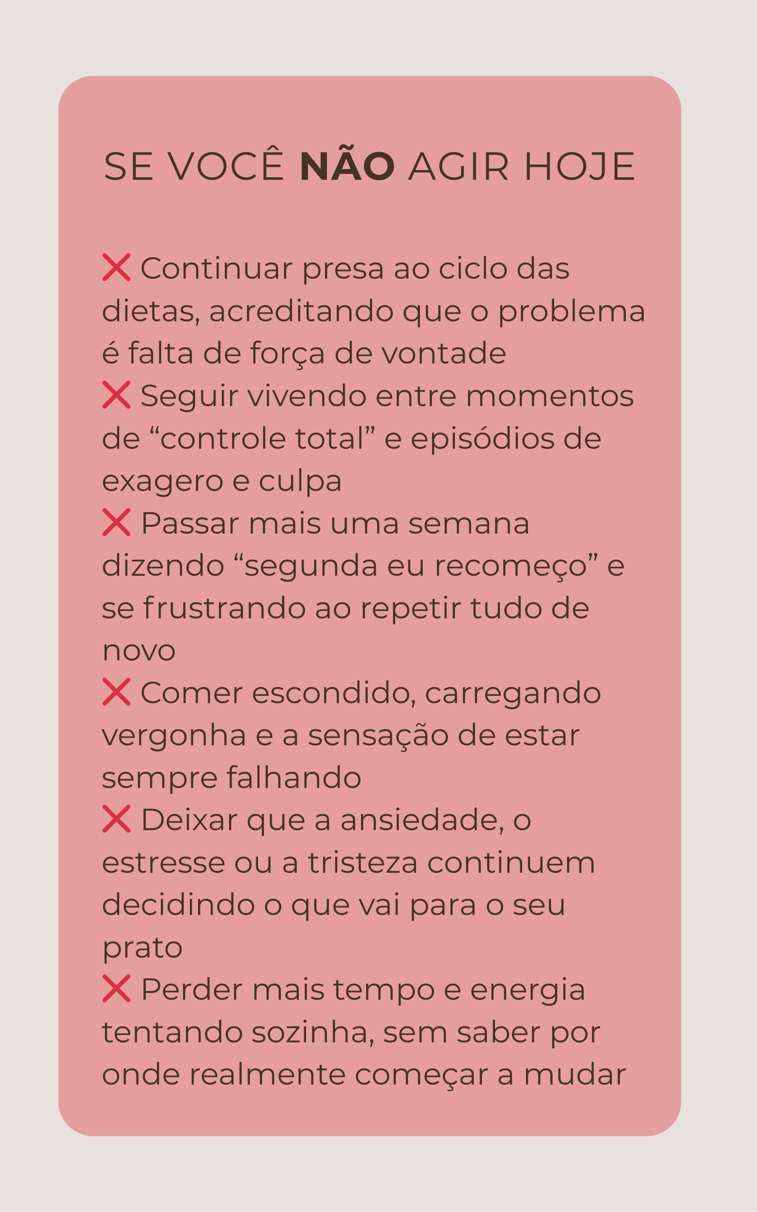 Você já prometeu que segunda-feira "começa a dieta" e no fim da semana acabou se sentindo péssima por não ter conseguido seguir? Viver entre culpa, exagero e controle é exaustivo, parece que a comida virou uma batalha diária. E por mais que você tente se policiar, nada muda de verdade. A boa noticia é que existe um caminho mais leve, onde comer deixa de ser uma luta e passa a ser um gesto de cuidado com você mesma.
