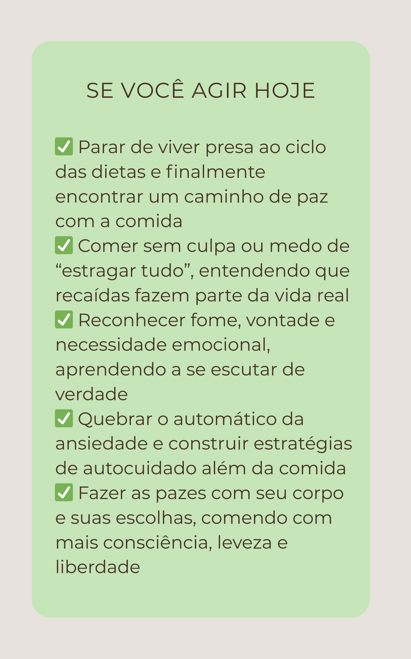 Que finalmente entendem a diferença entre fome e emoção, conseguem comer com prazer sem perder o equilíbrio e constroem uma relação leve e verdadeira com a comida, sem dietas, sem culpa e sem restrições impossíveis.